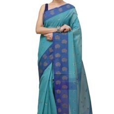 OISHANI SAREE GHOR Women’s Traditional Bengal Cotton Handloom Saree. (Turquoise Blue)