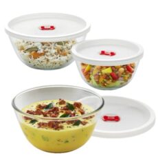 Borosil – Glass Lunch Box Set of 3, 320 ml, Microwave Safe Office Tiffin (12 x 12 x 6.5 cm, Transparent)