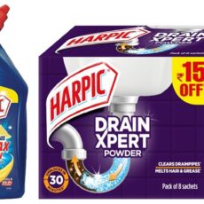 Harpic Disinfectant Toilet Cleaner Liquid, Orange – 1 L & Harpic Drain Xpert Drain Cleaner Powder (50g x 8) | Effective Sink Cleaner, Drain Blockage Remover, Drain Pipe Cleaner