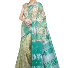 WoodenTant Women’s Bengal Made Soft Dhakai Jamdani Saree Without Blouse Piece. (Beige & Green, Cotton)