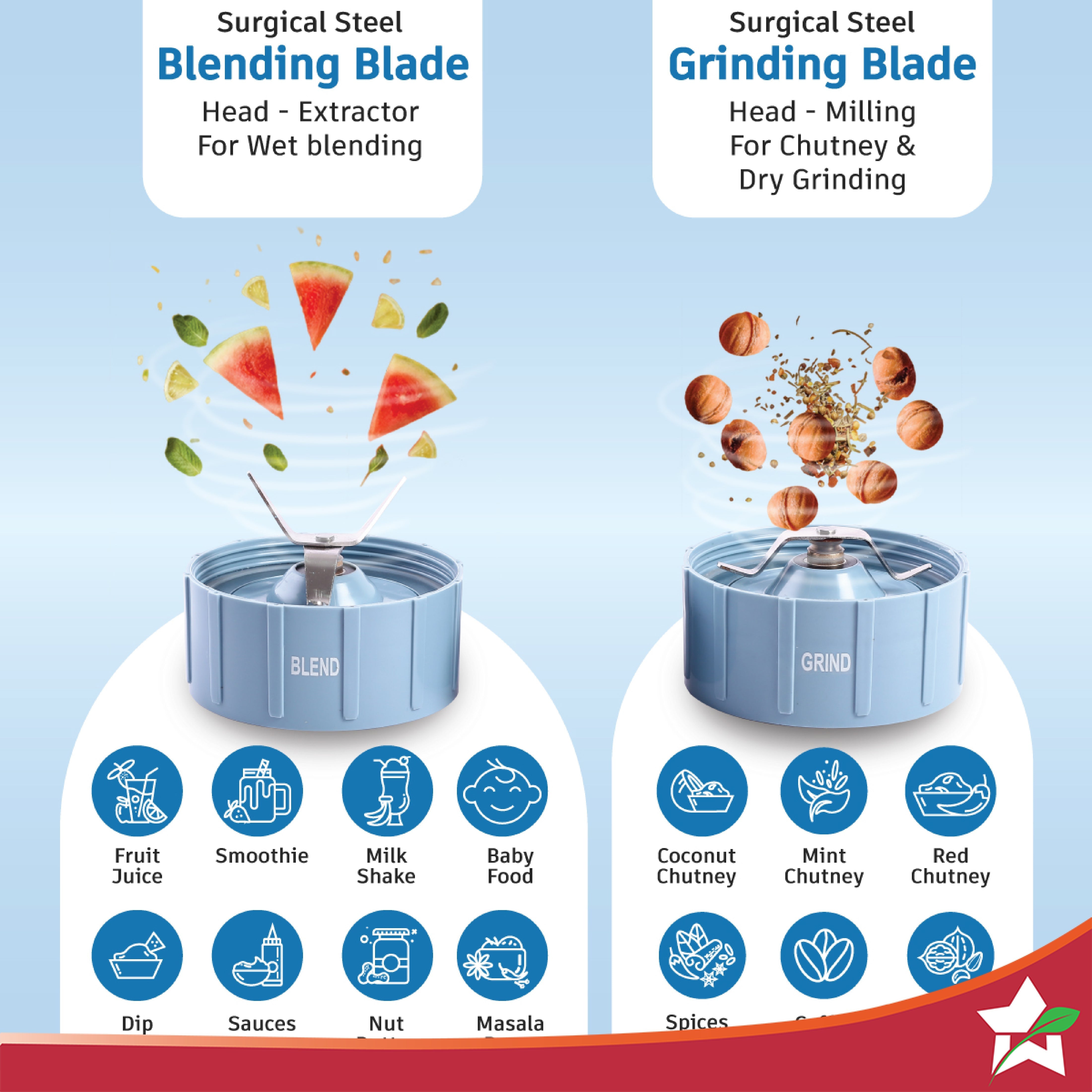 - Specialised Functions: The tall jar (500ml) comes with 4-wing blade for mixing-blending and the short jar (300ml) with 2-wing flat blade for grinding to make all kinds of chutneys, shakes, smoothies and masalas. Two useful lids – for storing and sprinkling come with the product