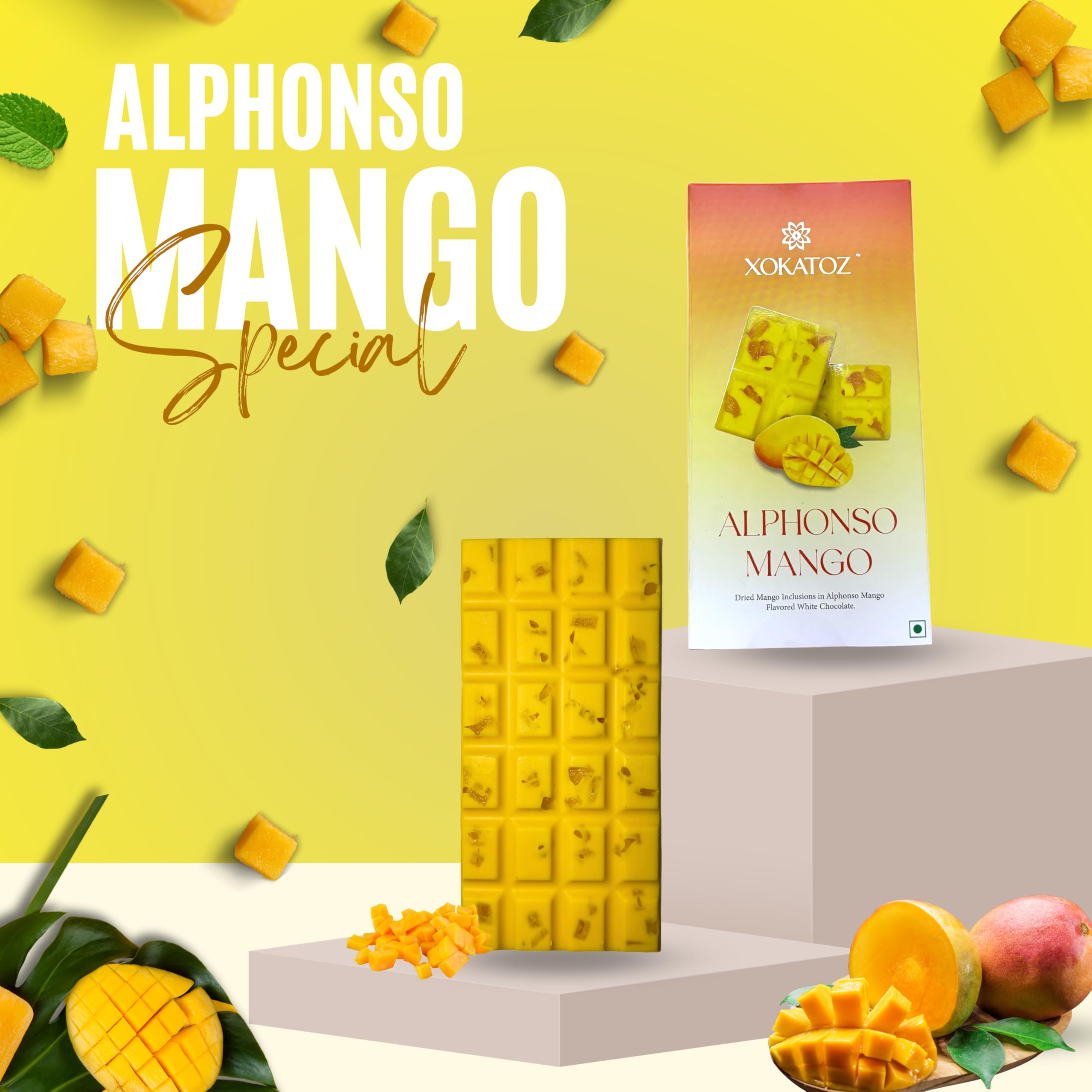 - Xokatoz Alphonso Mango: A Luscious Combination of Juicy Mango Chunks in Alphonso Mango Flavored Premium Chocolate. Indulge in an Exotic, Tropical Treat!